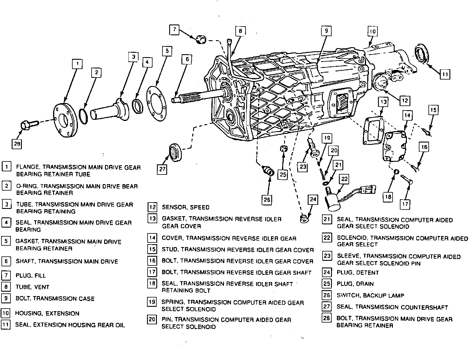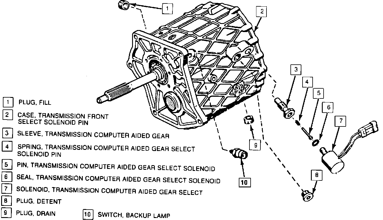 Bolt, Transmission Case....................................25 N-m (18 ft.lbs.) Bolt, Bearing Retainer.......................................21 N-m (15 ft.lbs.) Stud, Transmission Reverse Idler Gear Cover......21 N-m (15 ft.lbs.) Bolt, Transmission Reverse Idler Gear Cover.......21 N-m (15 ft.lbs. Bolt, Transmission Reverse Idler Gear Shaft.......21 N-m (15 ft.lbs.) Bolt, Speed Sensor Retainer..............................10 N-m (89 ft.lbs.) Plug, Detent....................................................35 N-m (26 ft.lbs.) Plug, Drain......................................................50 N-m (37 ft.lbs.) Plug, Fill.........................................................50 N-m (37 ft.lbs.) Tube, Vent......................................................15 N-m (11 ft.lbs.) Solenoid, Transmission Computer Aided Gear Select..........................................25 N-m (18 ft.lbs.) Switch, Backup Lamp........................................47 N-m (35 ft.lbs.)