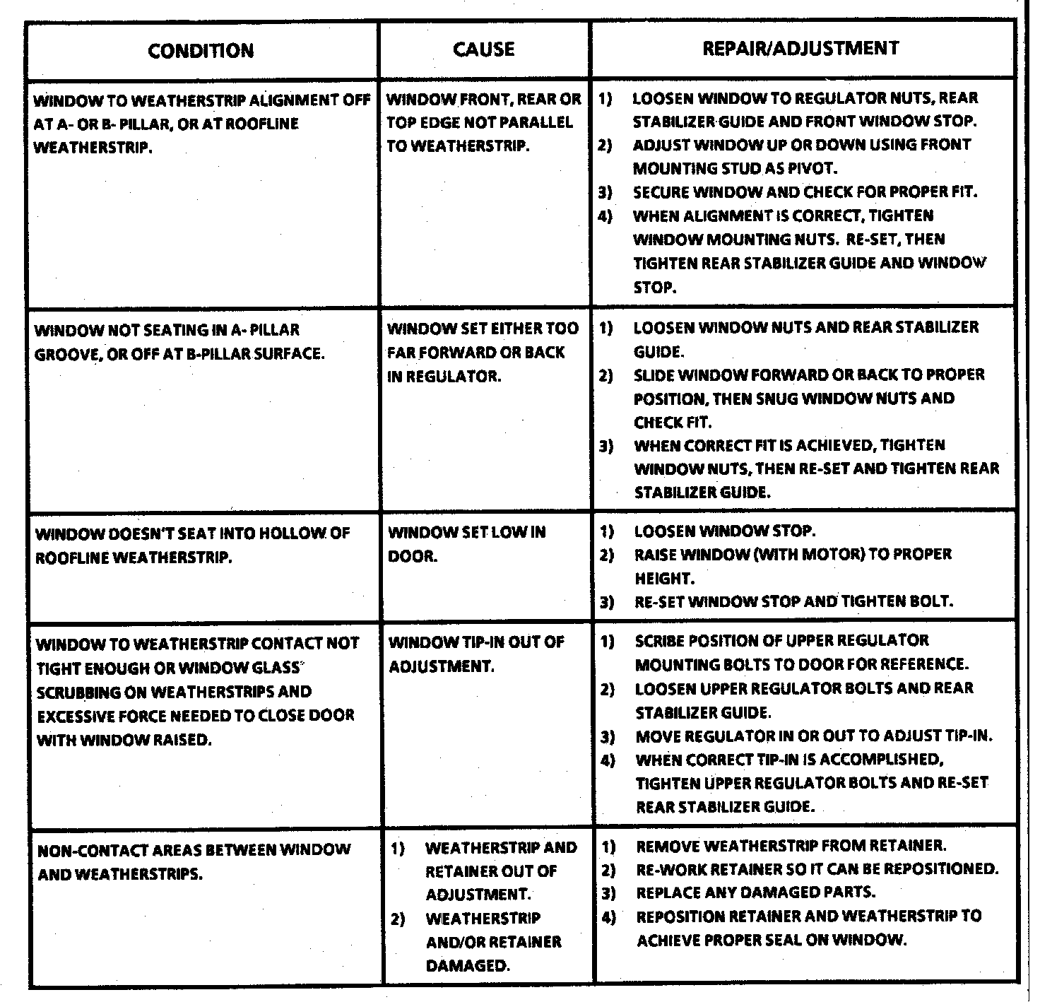 Window adjustment is necessary whenever the window is replaced, when the window regulator assembly is replaced, or when a visual inspection of the window reveals it to be improperly seated to the contacted weather strips for the side window.