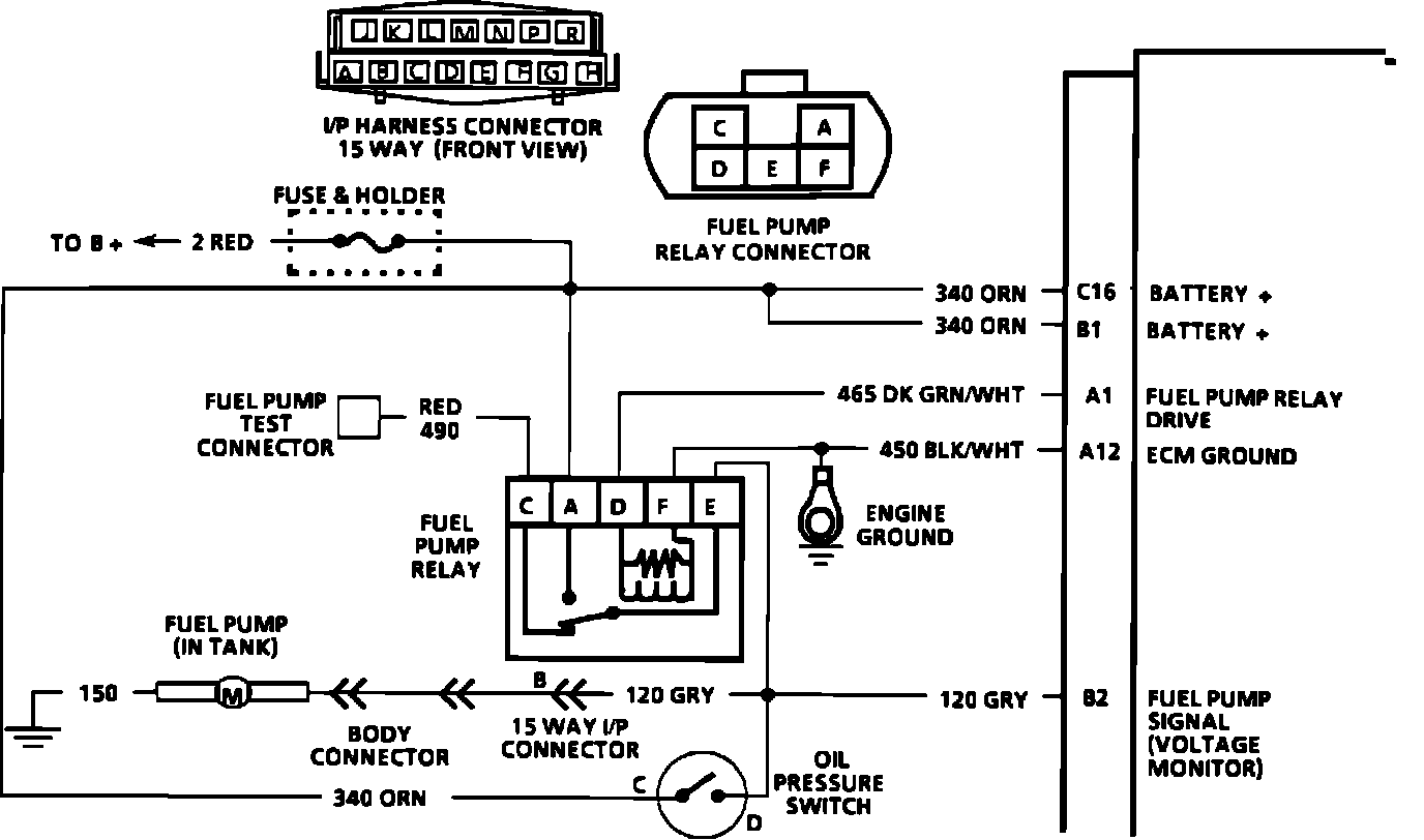 The oil pressure switch is mounted on the engine. This switch operates as a parallel power supply with the fuel pump relay to supply battery voltage to the fuel pump. Voltage is supplied to the fuel pump after approximately 28 kPa (4 PSI) oil pressure is reached.
