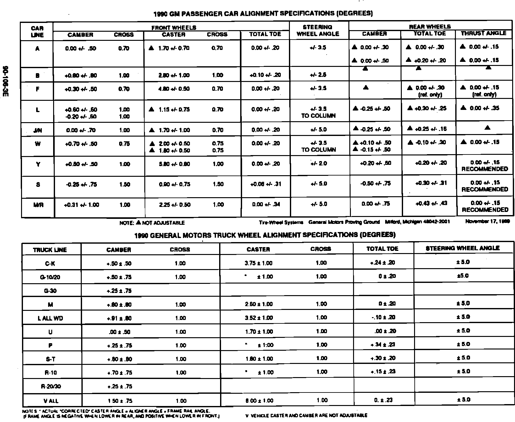 ATTACHED FOR YOUR INFORMATION ARE THE 1990 MODEL WHEEL ALIGNMENT SPECIFICATIONS FOR ALL GM PASSENGER CARS AND LIGHT TRUCKS.