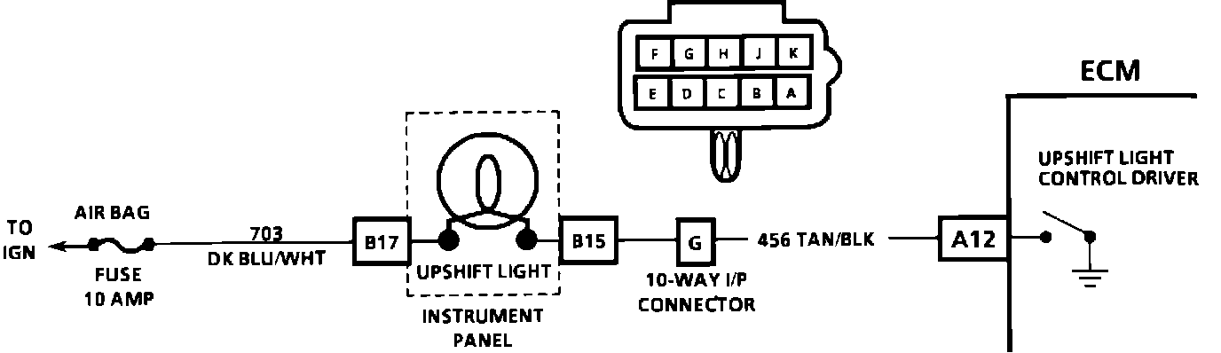 On early 1990 automatic transmissions equipped vehicles the upshift light will not work. These early built vehicles will have a LIGHT GREEN/BLACK wire between ECM terminals "A12" and cavity "G" of the 10 way instrument panel connector. However, there is no wire between cavity "G" of the 10 way instrument panel connector and terminal "B15" of the instrument panel connector. Later built 1990 automatic transmission equipped vehicles will have an operational upshift light as shown in the wiring diagram.