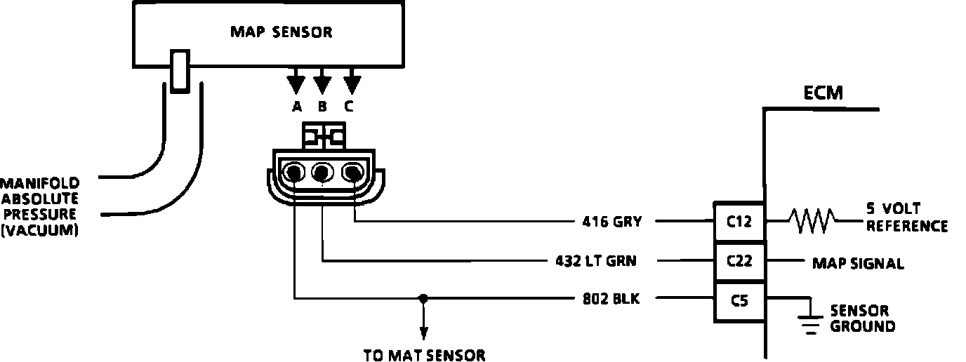 The Manifold Absolute Pressure (MAP) sensor responds to changes in manifold pressure (vacuum). The ECM sends a five volt reference to the MAP sensor. As manifold pressure changes, the output voltage of the sensor also changes. By monitoring the sensor output voltage, the ECM knows the manifold pressure. A lower pressure output voltage will be approximately 1.0-2.0 volts at idle. Higher pressure output voltage will be approximately 4.0-4.8 volts at Wide Open Throttle (WOT). The MAP sensor is also used, under certain conditions, to measure barometric pressure. This allows the ECM to make engine adjustments for different altitudes. The ECM uses the MAP sensor information to control fuel delivery and ignition timing.