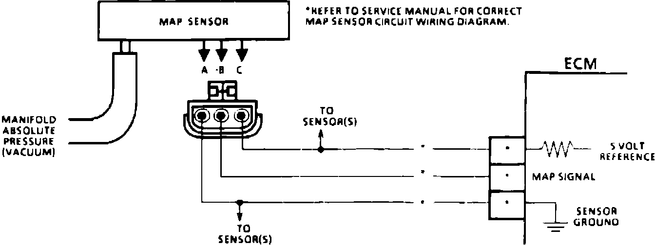2. Applying 34 kPa (10 inches Hg) vacuum to the MAP sensor should cause the voltage to change. Subtract second reading from the first. Voltage value should be greater than 1.5 volts. Upon applying vacuum to the sensor, the change in voltage should be instantaneous. A slow voltage change indicates a faulty sensor.