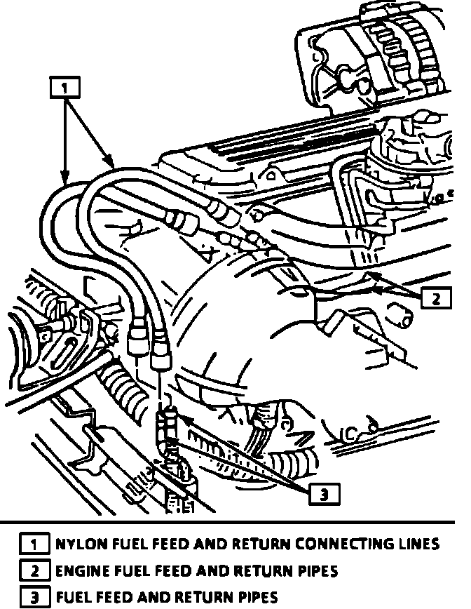 Nylon fuel lines are designed to perform the same function as the steel or rubber fuel lines they are replacing. The use of nylon fuel lines eliminates the 'knocking' noise that sometimes accompanied engine warm-up when metal lines were used. Nylon lines are made to withstand maximum fuel line pressure, exposure to fuel additives, and changes in weather. There are two sizes used: 3/8" ID for the fuel feed and 5/16" ID for the fuel return. The fuel feed and return lines are assembled and serviced as an assembly. Quick connect type fittings are used at the ends of the fuel feed/return lines and at the in-line fuel filter.