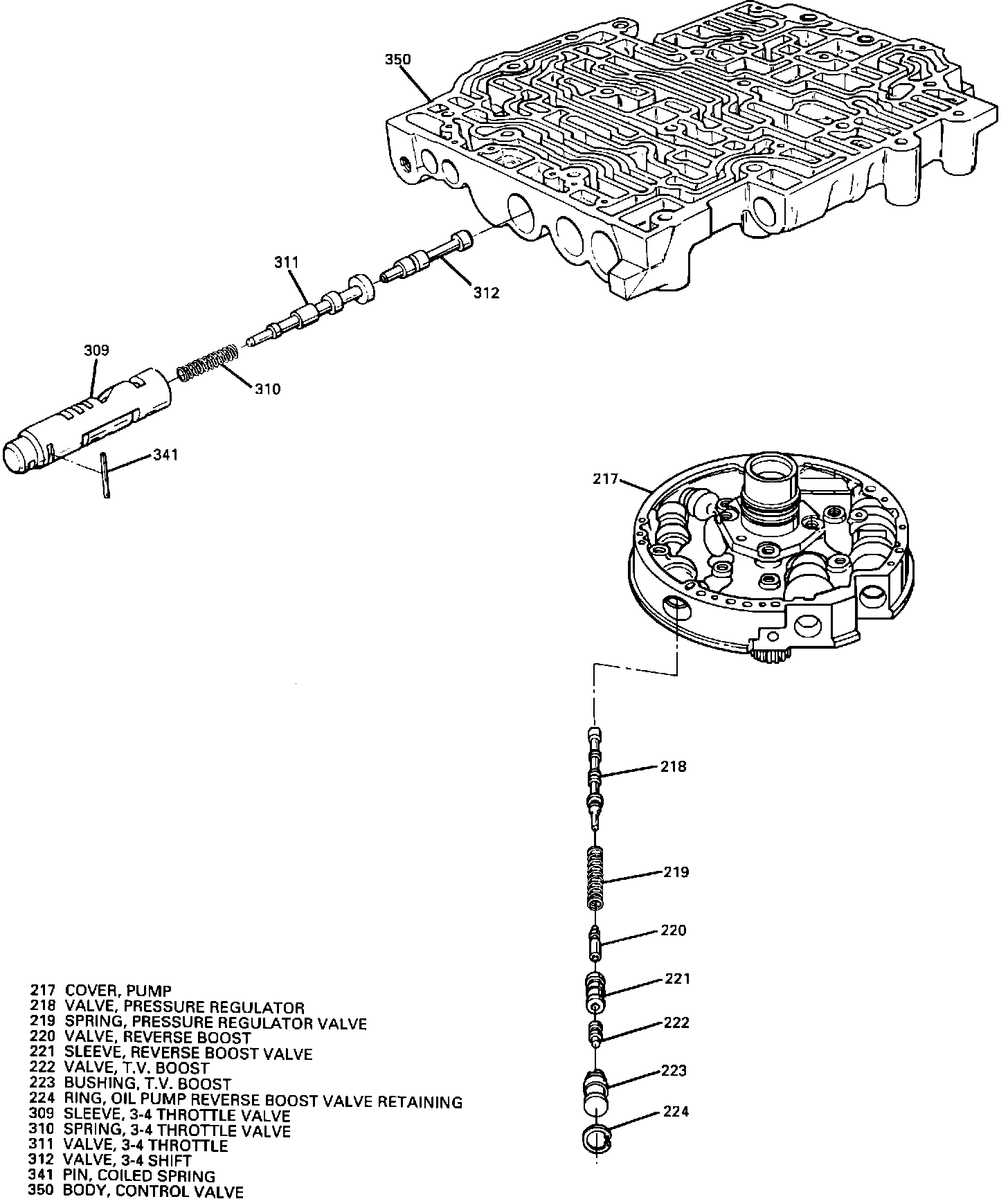 Install the TV boost valve and spring into the pump cover assembly. Install the 3-4 throttle valve, bushing and spring into the control valve assembly. Follow the procedures listed in the Automatic Transmission Unit Repair Section of the applicable Service Manual.