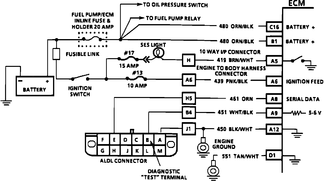 There should always be a steady "SERVICE ENGINE SOON" light when the ignition is "ON" and engine stopped. Battery ignition voltage is supplied to the light bulb. The ECM will turn the light on by grounding circuit 419. With the diagnostic terminal grounded, the light should flash a Code 12, followed by any trouble code(s) stored in memory. A steady light indicates a short to ground in the light control circuit 419, or an open in diagnostic circuit 451.
