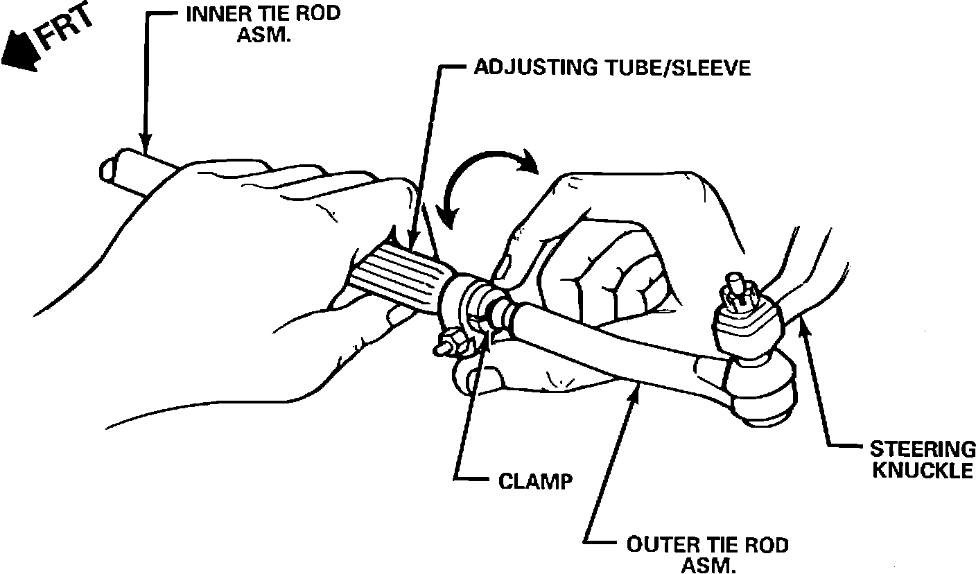 1. Raise and suitably support vehicle. Refer to General Information (Sec. 0A) of applicable Service Manual.2. Grasp adjusting tube/sleeve of adjustable tie rod assembly with one hand and attempt to rotate tube/sleeve clamps with opposite hand (see figure).