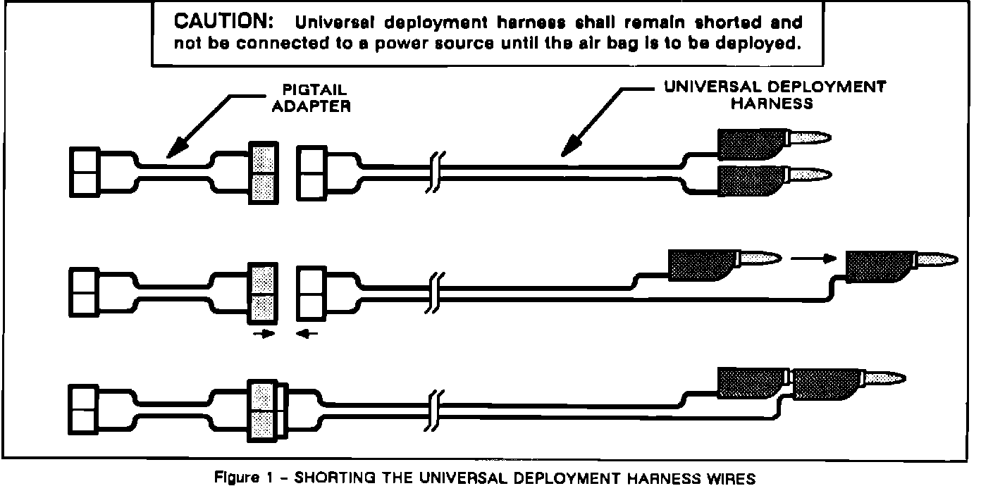 CAUTION: Failure to follow procedures in the order listed may result in personal injury. Never connect deployment harness to any power source before connecting deployment harness to the inflator module. Deployment harness shall remain shorted and not be connected to a power source until the air bag is to be deployed. The inflator module will immediately deploy the air bag when a power source is connected to it. Wear safety glasses throughout this entire deployment and disposal procedure.