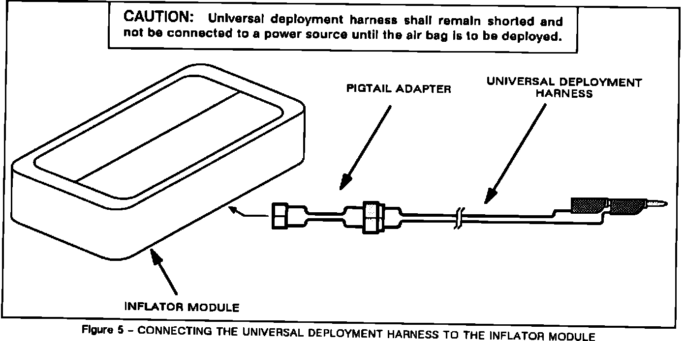 CAUTION: Deployment harness shall remain shorted and not be connected to a power source until the air bag is to be deployed. The inflator module will immediately deploy the air bag when a power source is connected to it. Connecting the deployment harness to the power source should always be the last step prior to deployment in the inflator module deployment procedure. Failure to follow procedures in the order listed may result in personal injury.
