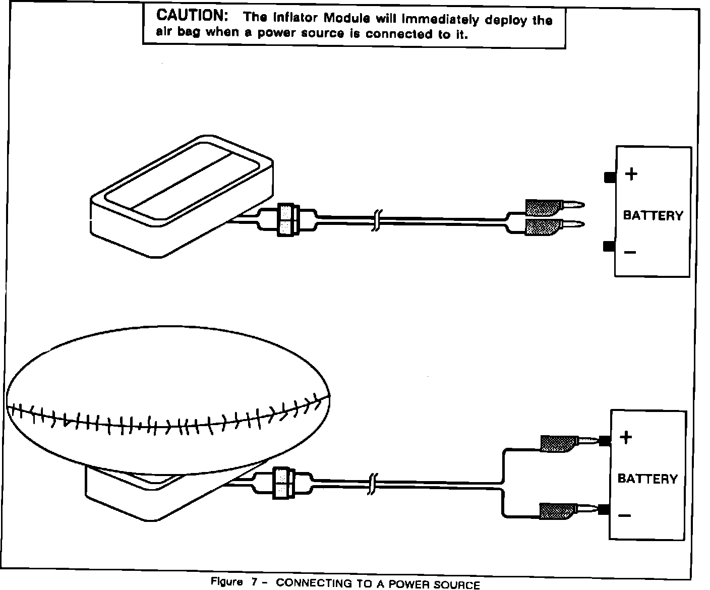 18. Connect the universal deployment harness wires to the power source to immediately deploy the inflator module. Refer to Figure 7.