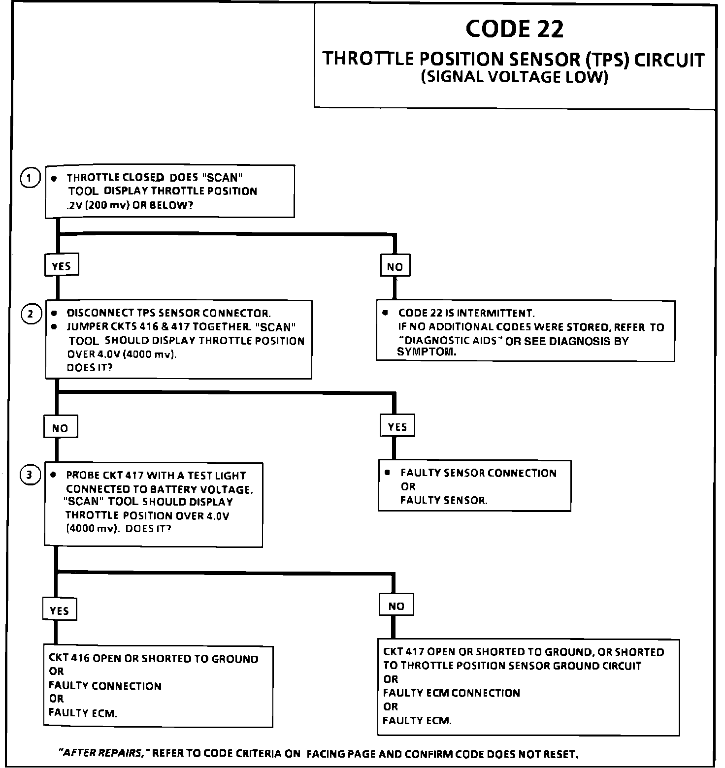 2. An open or grounded circuit 416 or 417 will result in a Code 22. If a Code 22 is intermittent, see DIAGNOSIS BY SYMPTOM.
