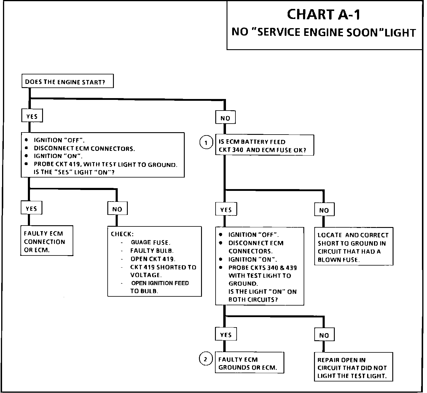 There should always be a steady "SERVICE ENGINE SOON" light when the ignition is "ON" and engine stopped. Battery ignition voltage is supplied to the light bulb. The ECM will control the light and turn it "ON" by providing a ground path through circuit 419 to the ECM.