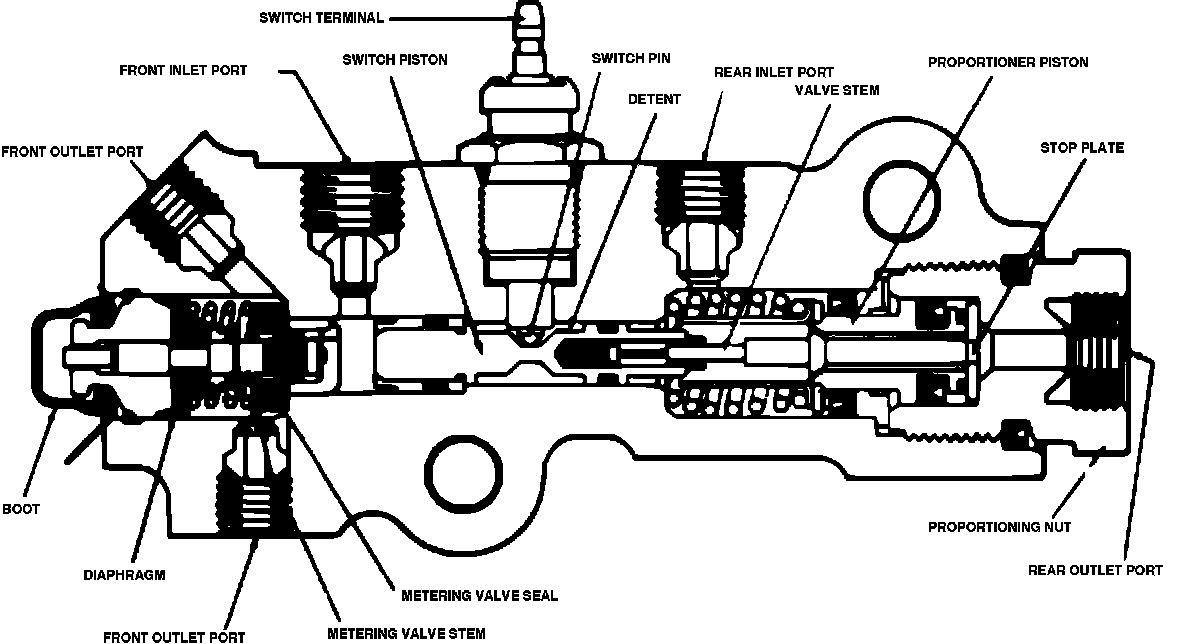 The combination valve, Fig. 8 is a metering valve, failure warning switch, and a proportioner in one assembly and is used on disc brake applications. The metering valve delays front disc braking until the rear drum brake shoes contact the drum. The failure warning switch is actuated in event of front or rear brake system failure, in turn activating a dash warning lamp. The proportioner balances front to rear braking action during rapid deceleration.