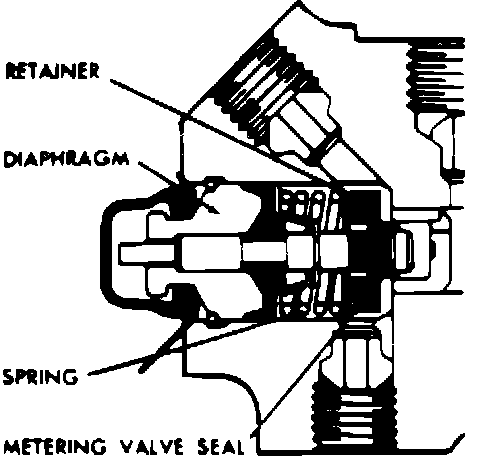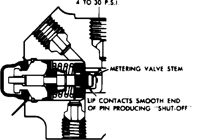 When the brakes are initially applied, the metering valve stem moves to the left, preventing fluid to flow through the valve to the front disc brakes. This is accomplished by the smooth end of the metering valve stem contacting the metering valve seal lip at 4 to 30 psi, Fig. 9. The metering valve spring holds the retainer against the seal until a predetermined pressure is produced at the valve inlet port which overcomes the spring pressure and permits hydraulic pressure to actuate the front disc brakes, Fig. 10. The increased pressure into the valve is metered through the valve seal, to the front disc brakes, producing an increased force on the diaphragm. The diaphragm then pulls the pin, in turn pulling the retainer and reduces the spring pressure on the metering valve seal. Eventually, the pressure reaches a point at which the spring is pulled away by the diaphragm pin and retainer, leaving the metering valve unrestricted, permitting full pressure to pass through the metering valve.