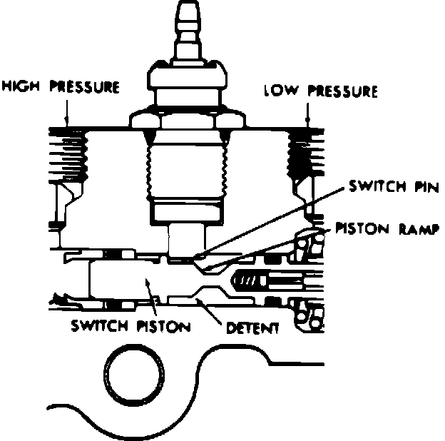 When repairs are made and pressure returns to the system, the piston moves to the left, resetting the switch. The detent on the piston requires approximately 100 to 450 psi to permit full reset of the piston. In event of front brake system failure, the piston moves to the left and the same sequence of events is followed as for rear system failure except the piston resets to the right.