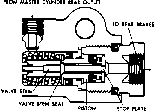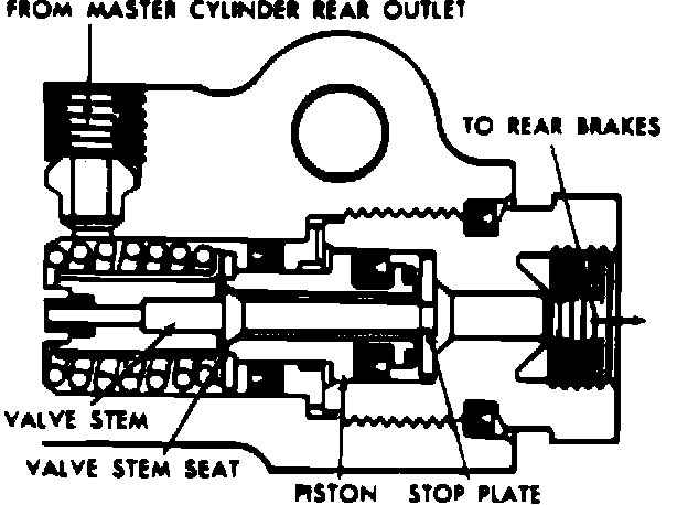 During rapid deceleration, a portion of vehicle weight is transferred to the front wheels. This resultant loss of weight at rear wheels must be compensated for to avoid early rear wheel skid. The proportioner or pressure control valve reduces rear brake system pressure, delaying rear wheel skid. When the proportioner or pressure control valve is incorporated in the combination valve assembly, pressure developed within the valve acts against the large end of the piston, overcoming the spring pressure, moving the piston left, Fig. 12. The piston then contacts the stem seat and restricts line pressure through the valve.