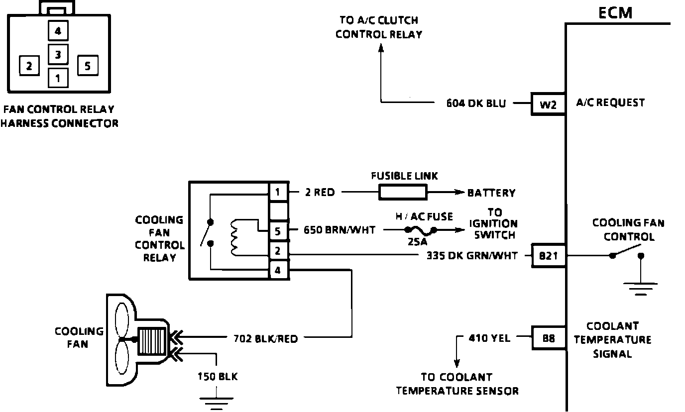 The ECM controls the engine coolant fan relay under several operating conditions. If the coolant temperature sensor indicates high engine temperature, the ECM will energize the relay to turn "ON" the fan. If the A/C is engaged, the ECM will turn the coolant fan on to cool the condenser as well as the radiator. Some fault codes will cause the ECM to turn on the fan. Above certain vehicle speeds, the ECM will de-energize the fan relay since at higher road speeds there is ample air flow.