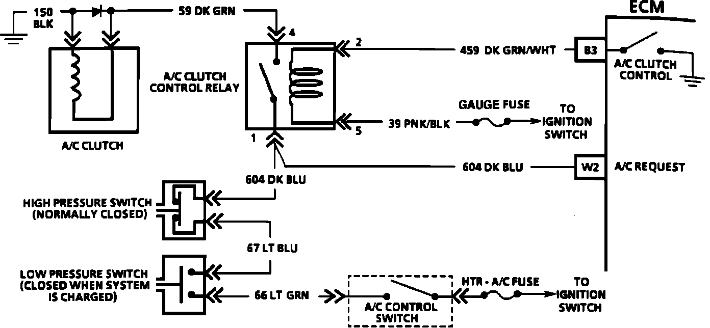 The ECM controls the A/C compressor clutch relay. When the A/C is turned on, the ECM delays the clutch engagement to allow the IAC valve to raise the engine idle speed to compensate for the added load. The ECM allows the relay to disengage the A/C clutch at wide open throttle.