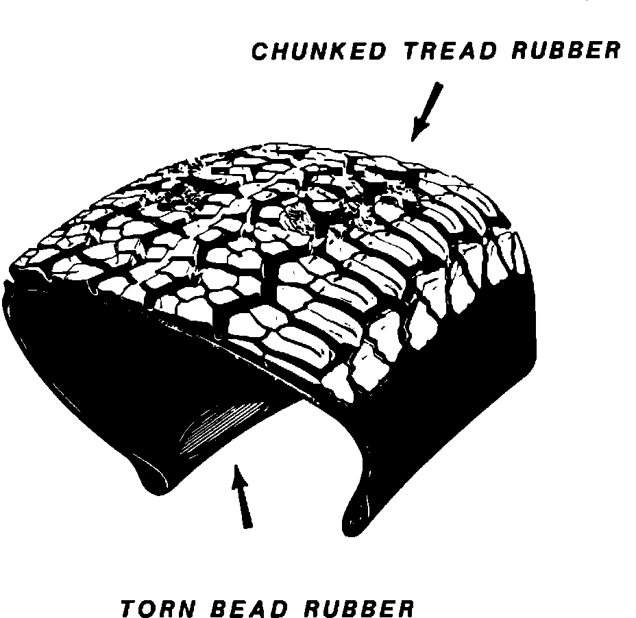 This condition is identified by small pieces of tread rubber torn or "chunked" out of the tire. This usually occurs in one area of the tread, although more than one area is possible. The missing tread rubber should be apparent upon visual inspection. It can also usually be detected as a once-per-rev tire noise upon road testing. This condition can happen in the assembly plant during the end of line line roll test. Hard braking such that the tire locks up on the roll could be the cause, although other variables during the roll test can also be factors. Other types of tire tread damage noted at delivery should be considered transportation damage.