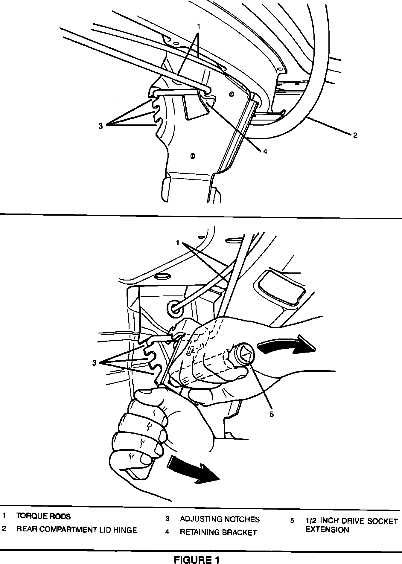 When adjusting the tension on torque rods, raise or lower either the right or left torque rod one adjusting notch at a time. It is important to keep the tension on both torque rods as close as possible. To increase the tension on the rear compartment lid hinge, move the end of the torque rod down a notch. To decrease the tension on the rear compartment lid hinge, move the end of the torque rod up a notch.