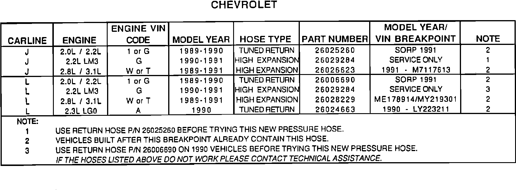 Starting with the following VIN breakpoints, 1991 model vehicles are being built with a new high expansion pressure hose which corrects this condition. Vehicles built BEFORE the VIN breakpoints listed below may be repaired by installing a new high expansion pressure hose, P/N 26026623.