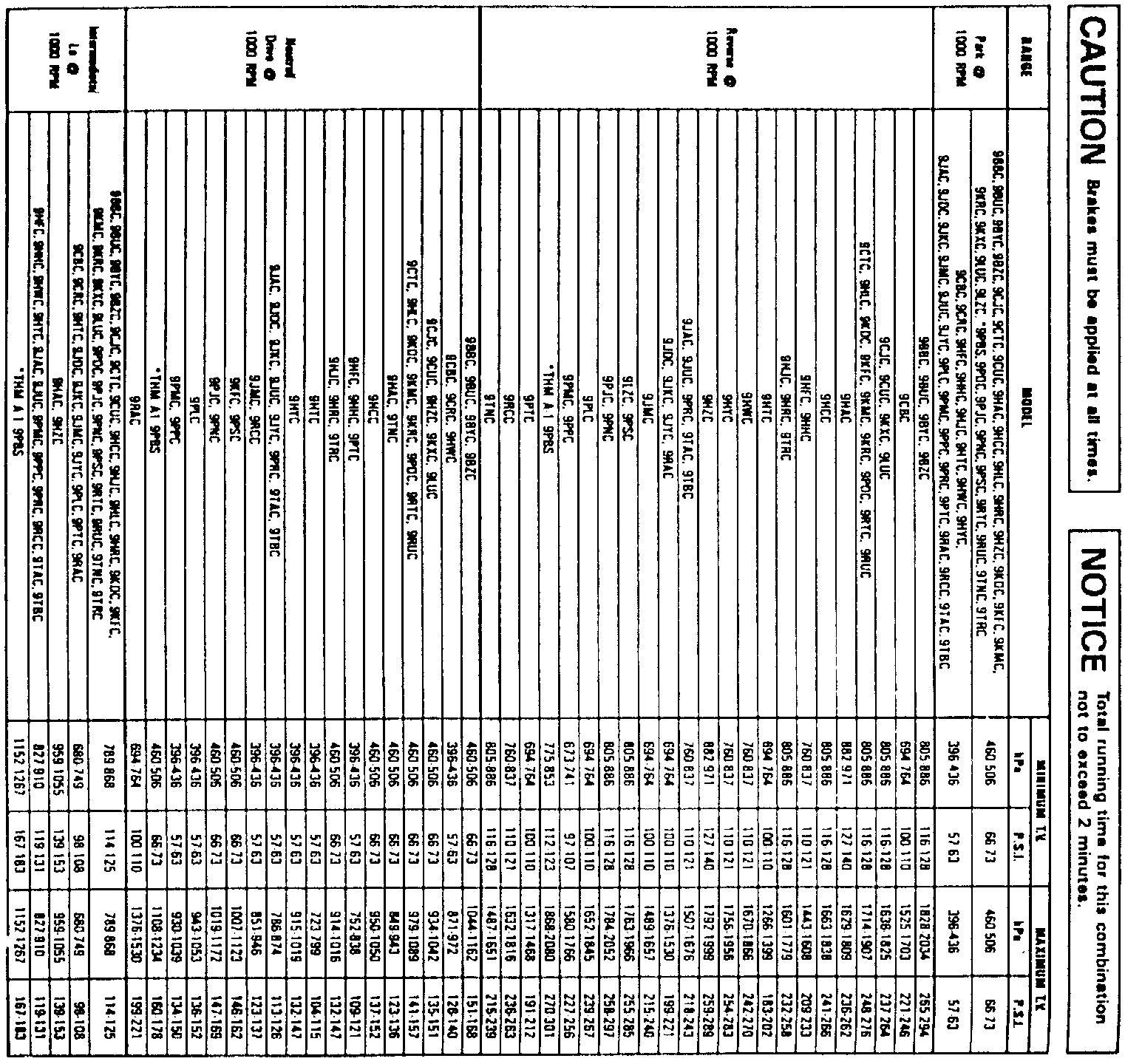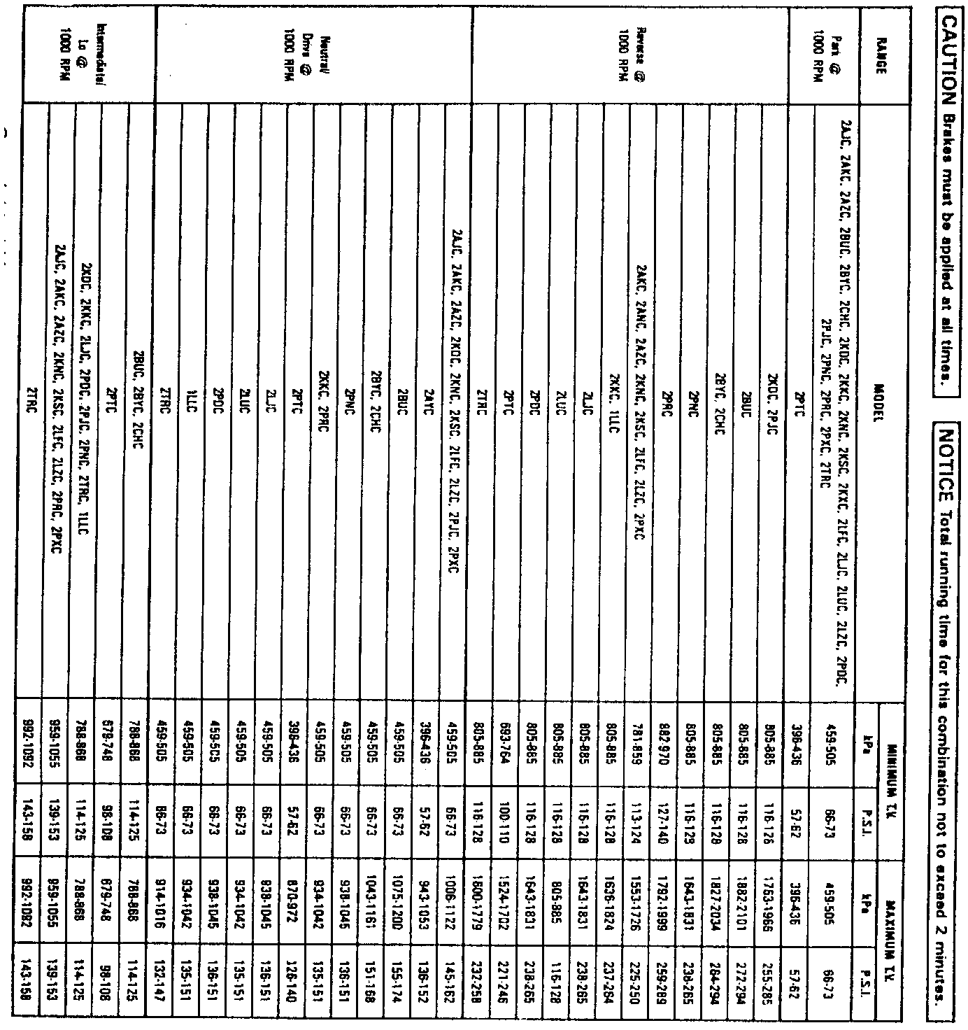 7. To check full throttle valve line pressure, tie or hold the TV to the full extent of its travel, then with brakes applied, transaxle in range specified and engine at specified speed, check pressures also according to the chart.