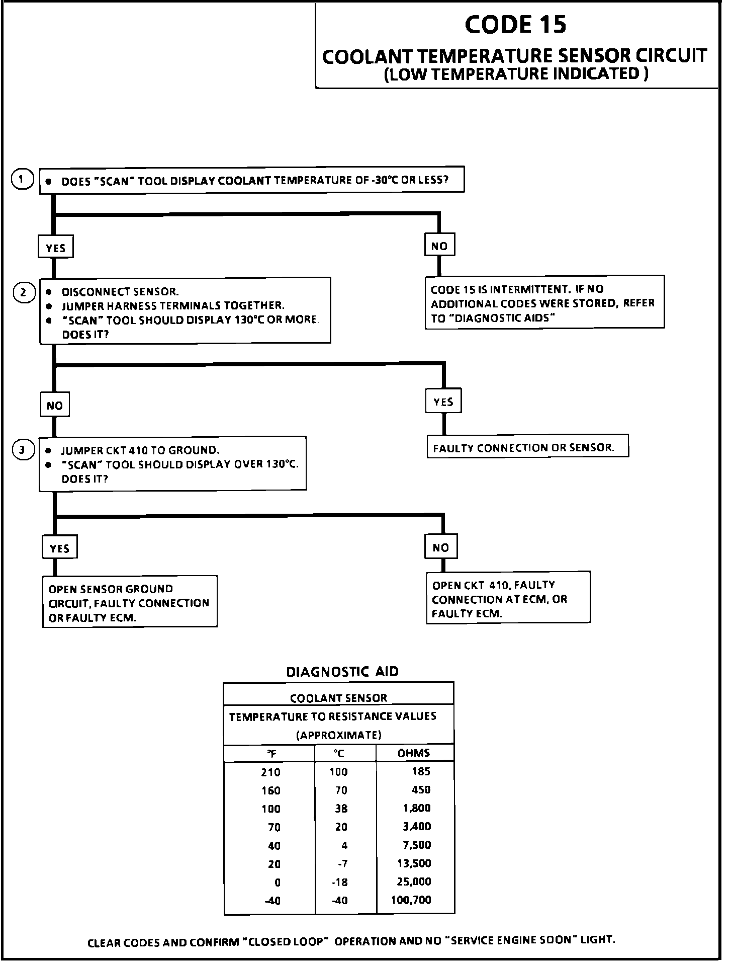 A "Scan" tool reads engine temperature in degrees centigrade. After engine is started the temperature should rise steadily to about 90 degrees C then stabilize when thermostat opens. A faulty connection, or an open circuit will result in a Code 15. If Code 21 or 23 is also set, check ground CKT 452 for faulty wiring or connections. Check terminals at sensor for good contact. Refer to TESTING PROCEDURES/DIAGNOSIS BY SYMPTOM/INTERMITTENTS.