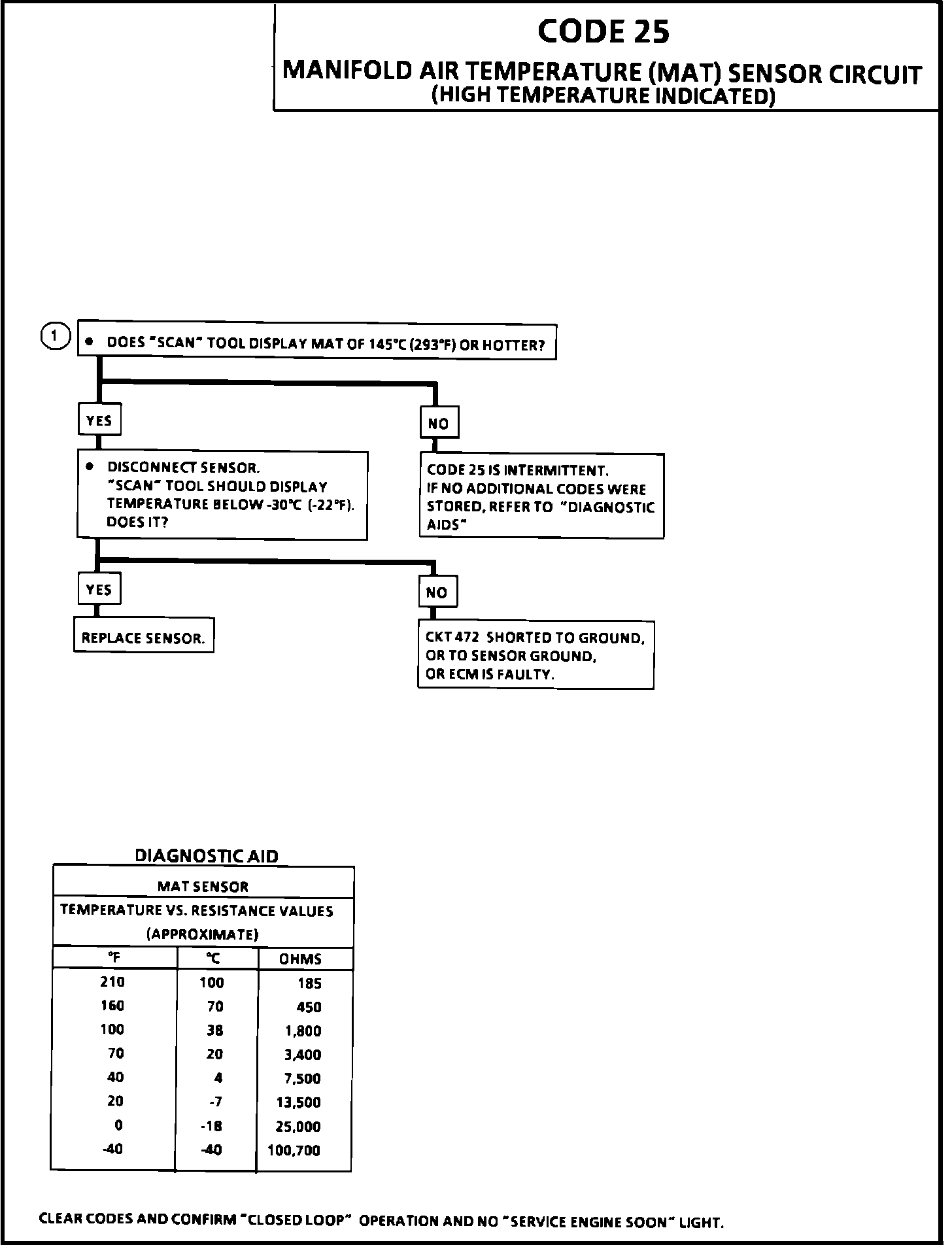 A "Scan" tool reads temperature of the air entering the engine and should read close to ambient air temperature, when engine is cold, and rises as underhood temperature increases. A faulty connection, or an open in CKT 472 or 452 will result in a Code 23. Refer to TESTING PROCEDURES/DIAGNOSIS BY SYMPTOM/INTERMITTENTS.