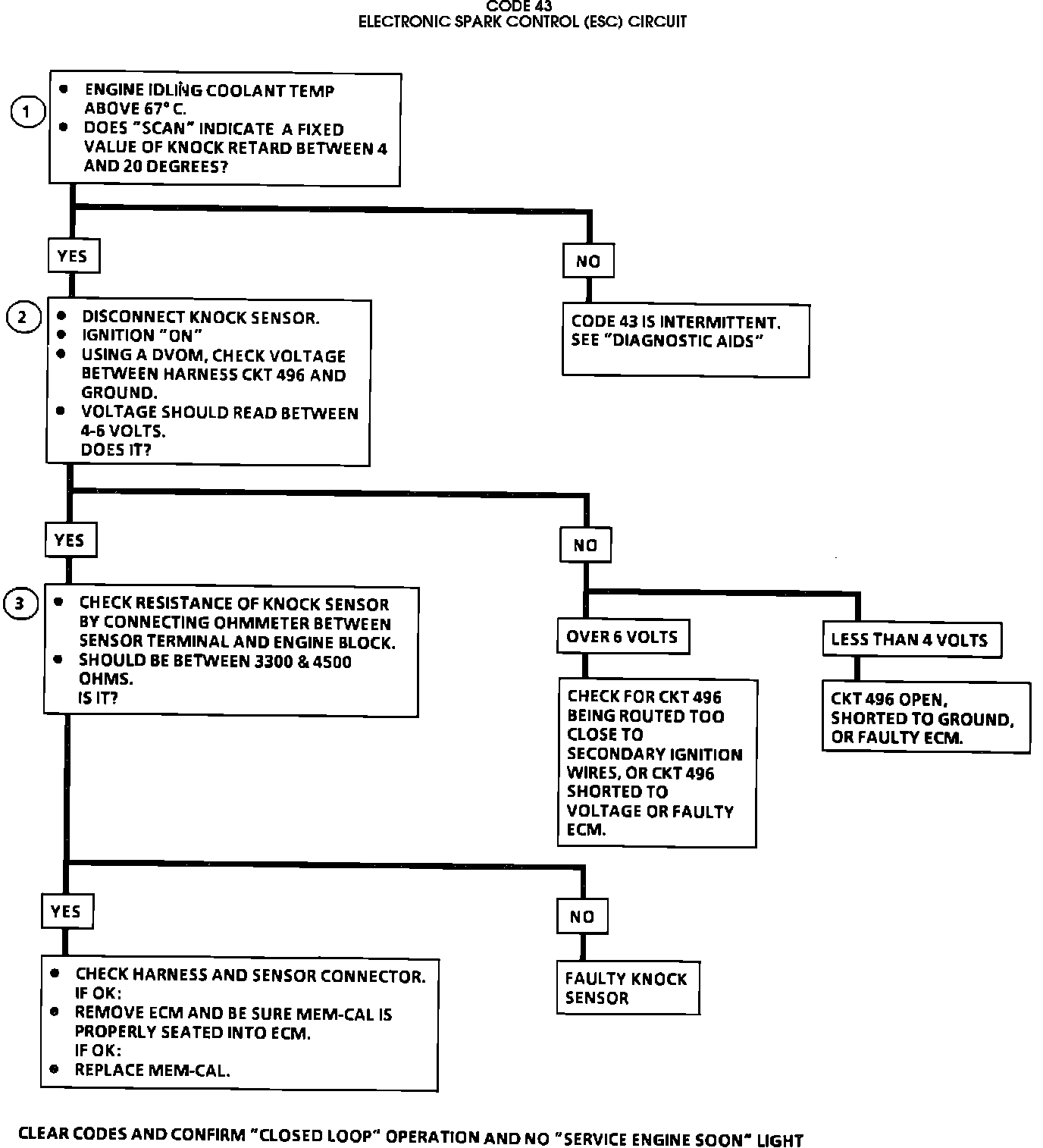1. This step determines if the condition for a Code 43 still exist (voltage on CKT 496 above 4.6 volts or below 0.64 volts). The system is designed to retard the timing 6~ if either condition exist.