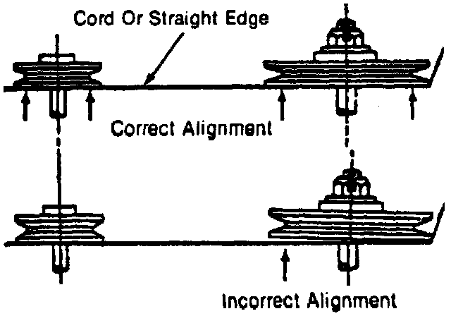 Belts Aligned Incorrectly - The drive belt does not line up straight between the drive pulley and operating pulley. This may result in premature belt failure or belt squeal.