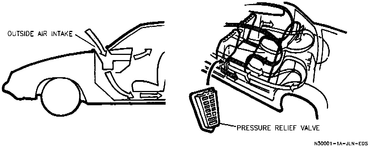 This vehicle has a "flow-through" ventilation system. A supply of outside air flows into the vehicle when the blower motor is running. With the side windows closed, some air will flow into the cowl air inlet grille, through the vehicle and out the pressure relief valves.