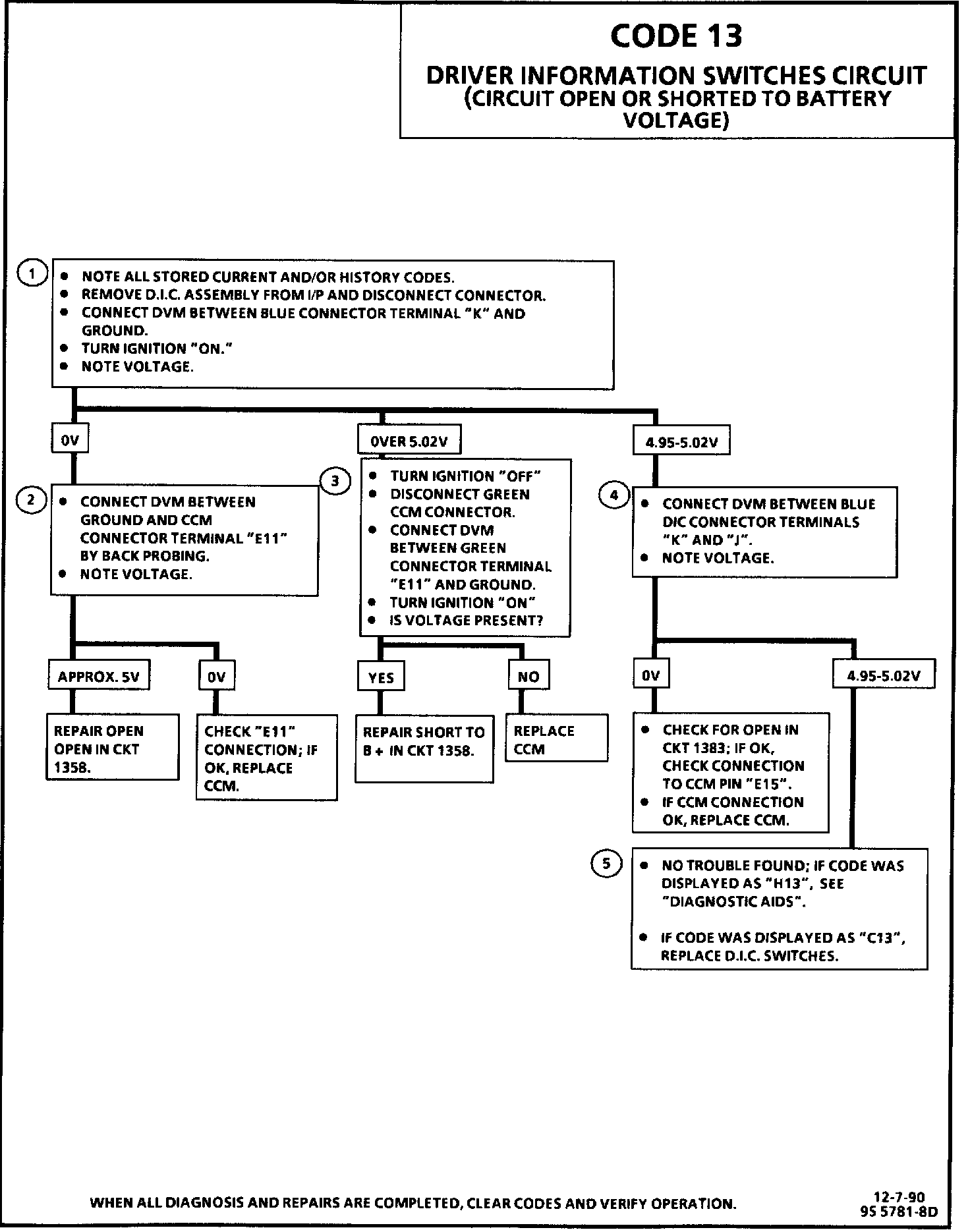 If the CCM senses 5 volts (open) or more (short to B+) in CKT 1358 for more than 3 seconds, Code 13 is set.