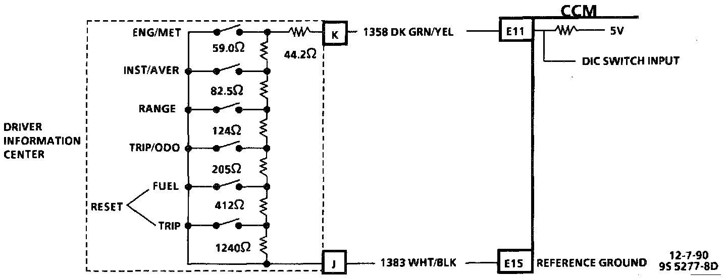 The Driver Information Center (DIC) switches circuit contains a number of resistors. When a particular switch is pressed, this selects a specific resistance value since the circuit current passes through only some of the resistors. By "watching" the output voltage from CCM pin E11, the CCM determines which switch was pressed and performs the desired function.