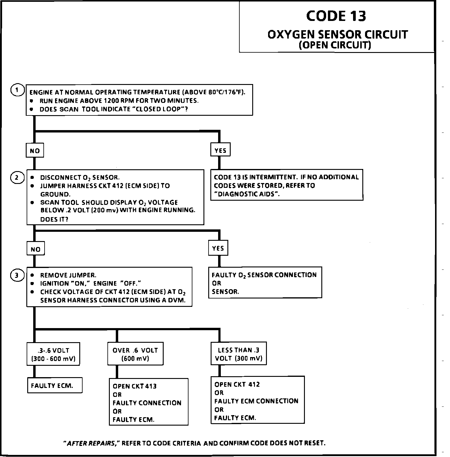 Normal "Scan" voltage varies between 100 mV to 999 mV (0.1 and 1.0 volt) while in "Closed Loop". Code 13 sets in one minute if voltage remains between 0.35 and 0.55 volt, but the system will go "Open Loop" in about 15 seconds. Refer to TESTING PROCEDURES/DIAGNOSIS BY SYMPTOM/INTERMITTENTS.