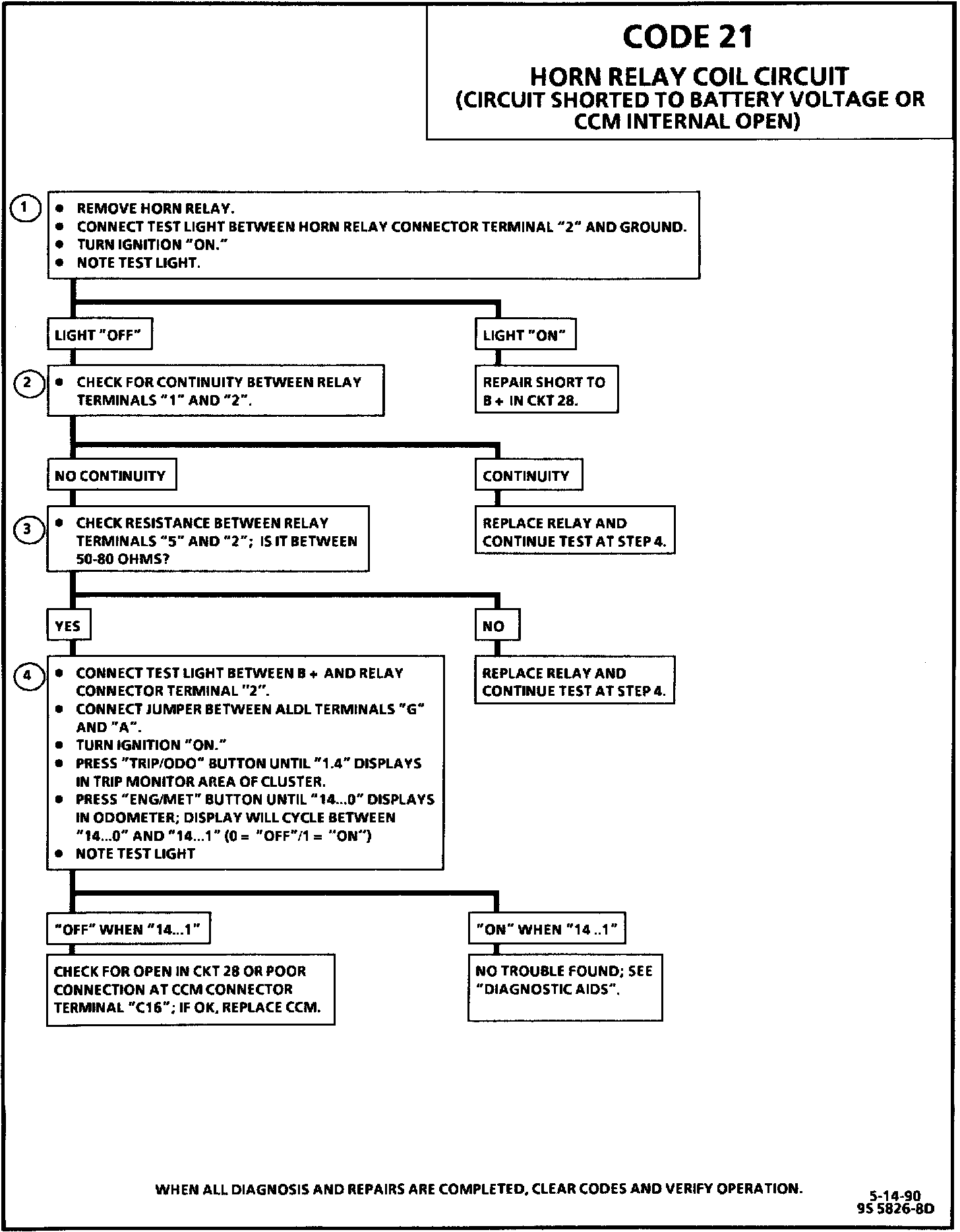 Code 21 will set when CKT 28 is in a high state (not grounded by the CCM) for more than 600 milliseconds while the CCM is attempting to actuate the horn control relay.