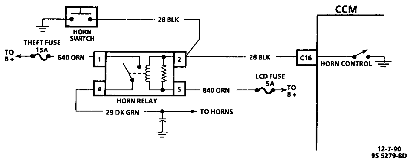 The horn relay coil circuit is part of a "standard" horn system, except for the addition of CCM control of the system through CKT 28. The CCM can activate the horns if the anti-theft system signals it to do so; the CCM completes the ground for the relay coil circuit, normally provided through the horn switch on the steering wheel.