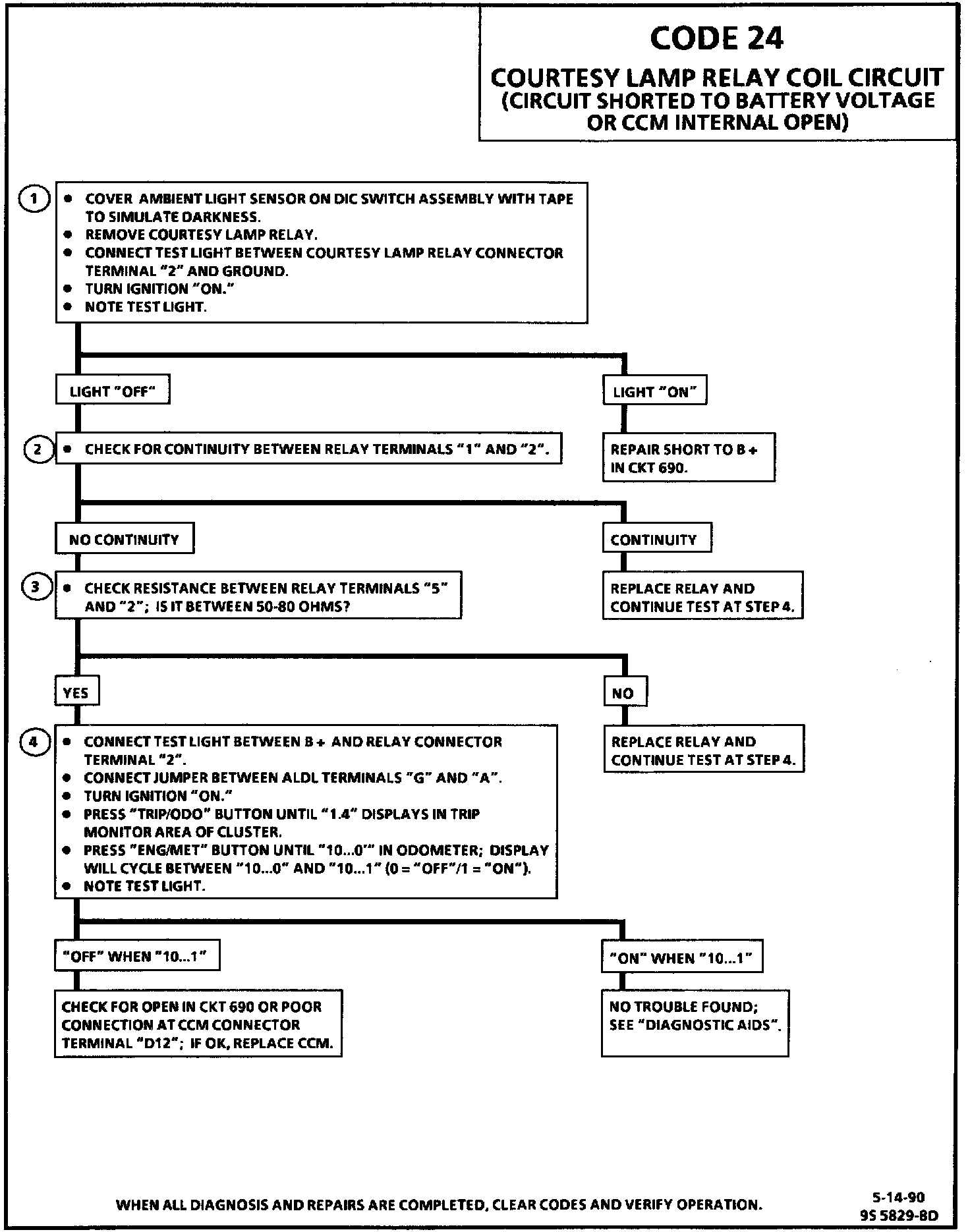 Code 24 will set when CKT 690 is in a high state (not grounded by the CCM) for more than 600 milliseconds while the CCM is attempting to activate the courtesy lamp control relay.