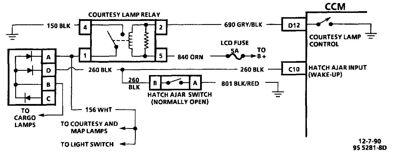 The courtesy lamp relay coil circuit is completed by the CCM when it receives a courtesy lamps "ON" request from any of a number of different inputs (door lock switches, door ajar switches); the CCM grounds CKT 690, energizing the relay coil.