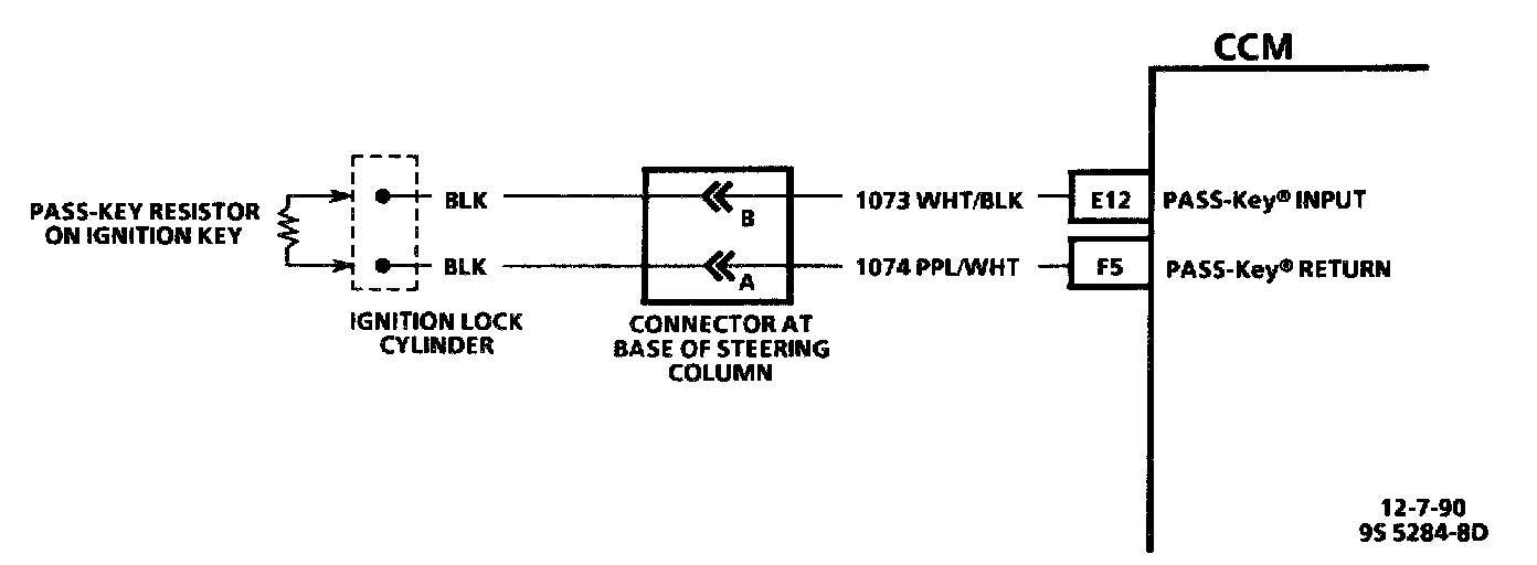The PASS-Key(R) detection circuit is completed by the PASS-Key(R) (with embedded resistor pellet) in the ignition lock cylinder. Contacts in the ignition lock cylinder mate with those on the pellet, and the CCM reads the key pellet resistance.