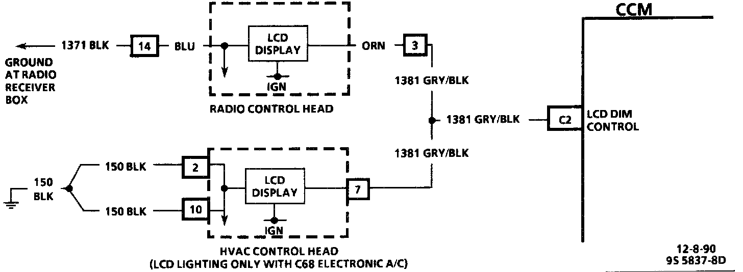 The LCD Dimming Output Circuit, which controls the back lighting on the radio control head (and the HVAC control head when equipped with C68 Electronic Climate Control), receives its ground in the form of a PWM output from the CCM through CKT 1381. Power is supplied to the circuit internally through the radio control head (and HVAC control head, if equipped).