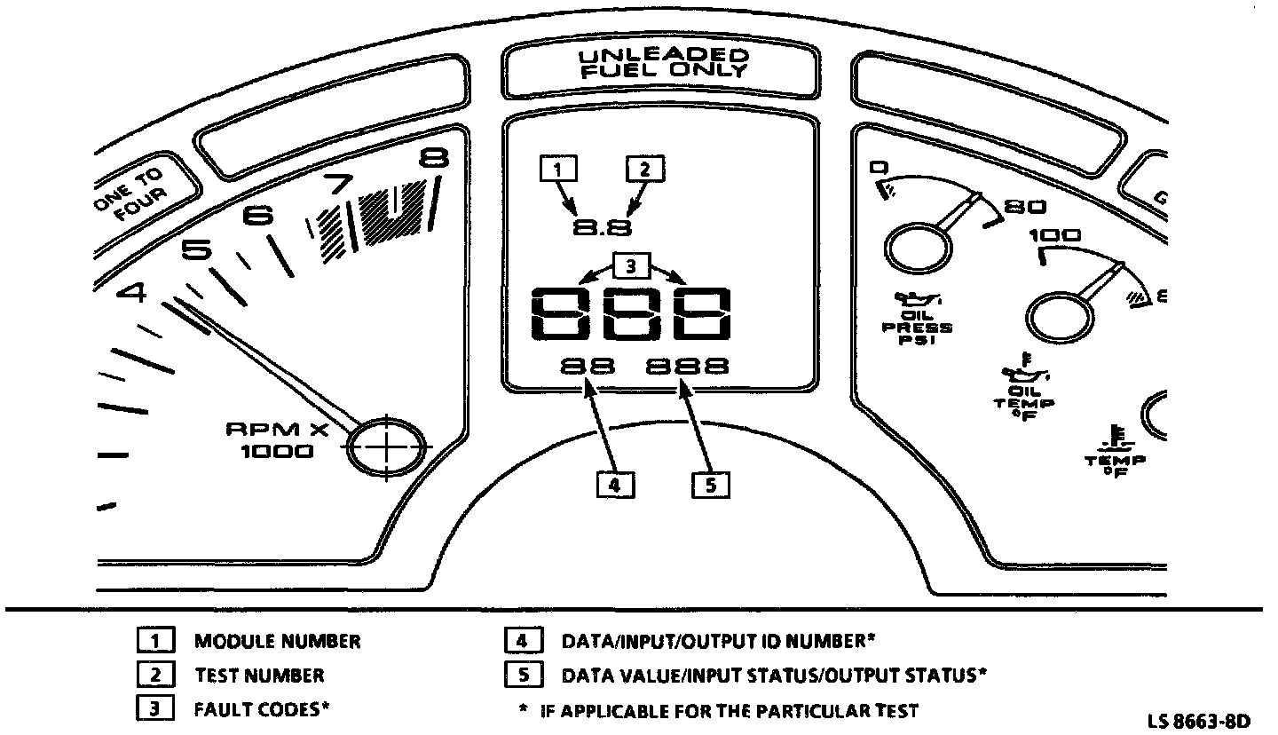 The speedometer is used to display malfunction codes (both CCM and ECM), the odometer displays data, and the trip monitor indicates the system being tested and the test which is being performed. See illustration. The buttons on the Driver Information Center (DIC) are used to send instructions to the CCM when in the diagnostic mode. See illustration.