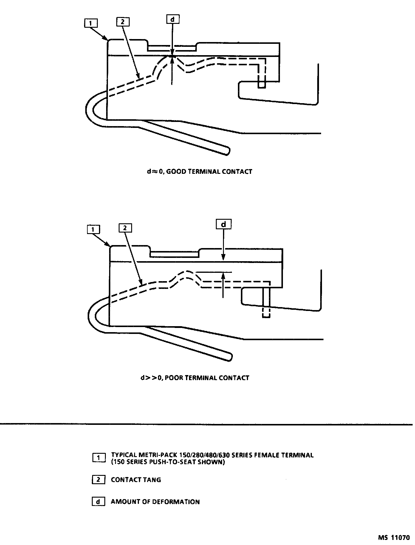 Deformation is caused by probing the mating side of a connector terminal without the proper adapter, improperly joining the connector halves or repeatedly separating and joining the connector halves. Deformation, usually to the female terminal contact tang, can result in poor terminal contact causing an open or intermittently open circuit.