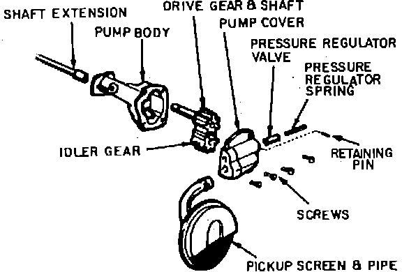 13. Reverse procedure to assemble. Turn drive shaft by hand to check for smooth operation. The pump gears and body are not serviced separately. If the pump gears or body are damaged or worn, the pump assembly should be replaced. Also, if the pick-up screen and pump assembly was removed, it should be replaced with a new one as loss of the press fit condition could result in an air leak and loss of oil pressure.