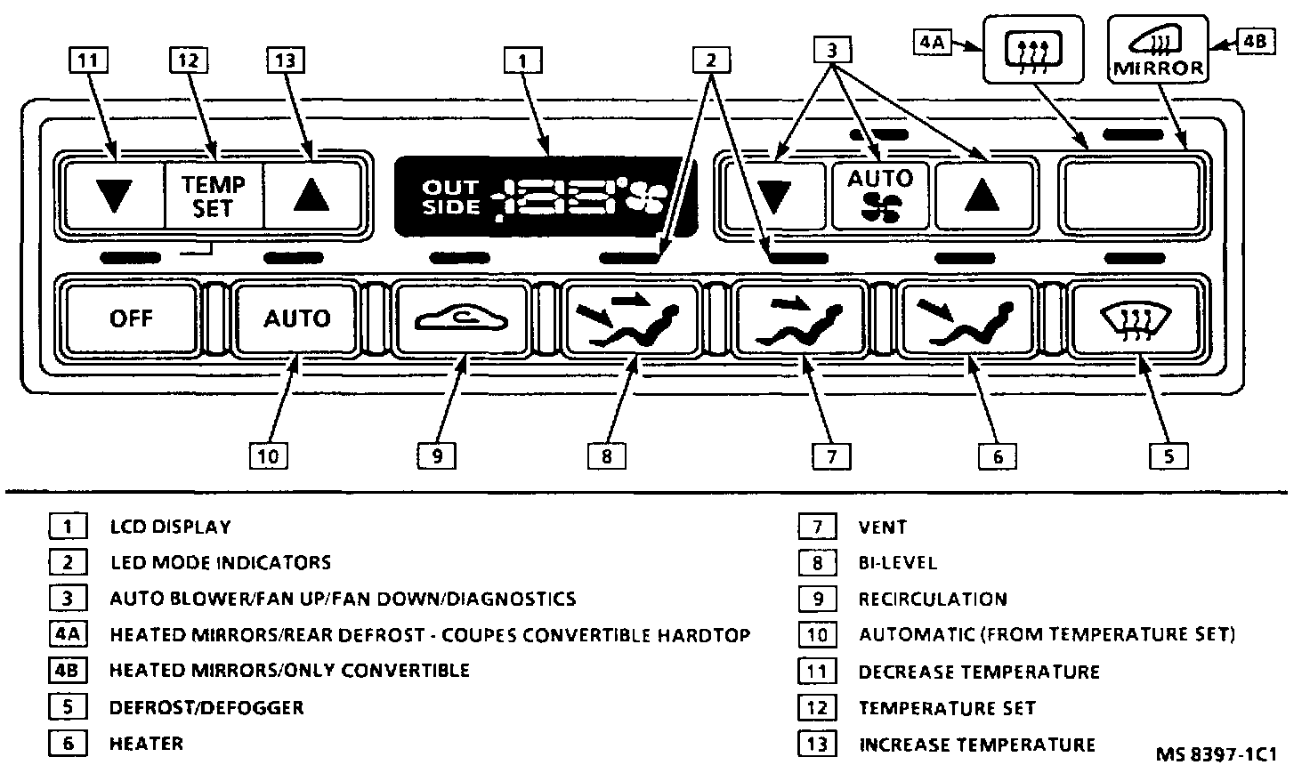 OUTSIDE HEATED MIRROR - This setting will operate the heated mirrors on convertibles. The first time the button is pressed, the unit will run for approximately ten minutes, then shut "OFF." After completing this cycle, the unit will run for approximately five minutes when reactivated. The outside heated mirrors will only operate with the ignition in the "ON" position.