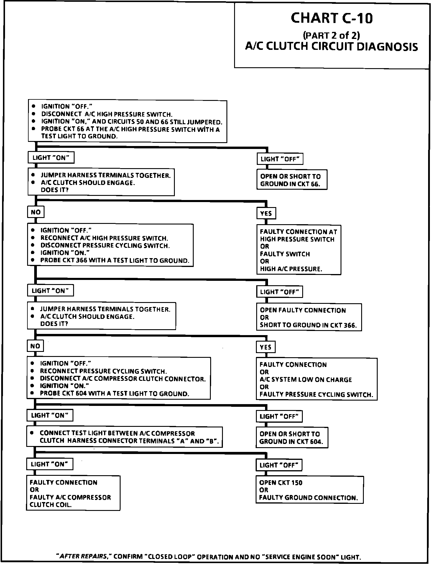 When a request for A/C has been detected by the ECM, the ECM will ground the A/C clutch control relay drive circuit, the relay contacts will close and energize the compressor clutch portion of the circuit. If the system is properly charged, the circuit will be complete to the A/C compressor clutch.