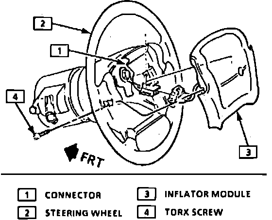 6. Lift inflator module from steering wheel, then disconnect electrical connectors and connector position assurance from inflator module. To lessen chances of personal injury, when carrying an inflator module, position bag and trim cover away you. Never carry module by wiring or electrical connector. Also when placing inflator module on work bench or other surface, face bag and trim cover upward, away from surface.