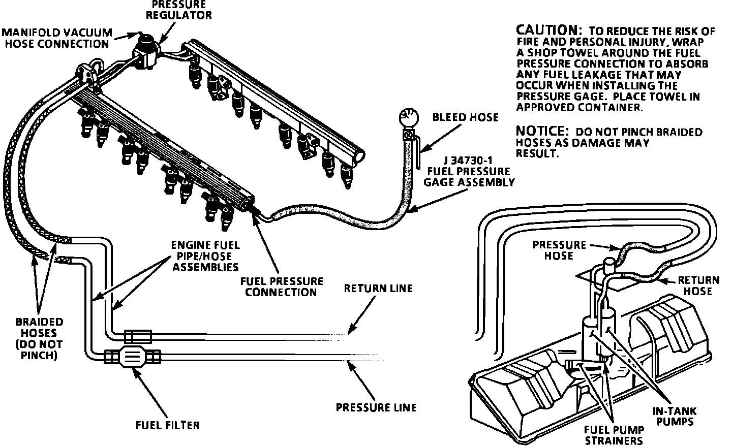 Do not pinch or restrict braided fuel hoses as damage may result.
