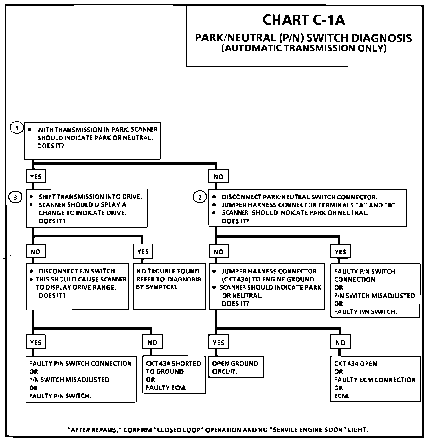1. Checks for a closed switch to ground in park position. Different makes of "Scan" tools will read P/N differently. Refer to operators manual for type of display used for a specific tool.