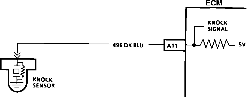 The ESC knock sensor detects abnormal vibration (spark knocking) in the engine. The sensor is mounted in the engine block near the cylinders. The sensor produces a AC output voltage which increases with the severity of the knock. This signal voltage inputs to the ECM. The ECM then adjust the Electronic Spark Timing (EST) to reduce spark knocking.