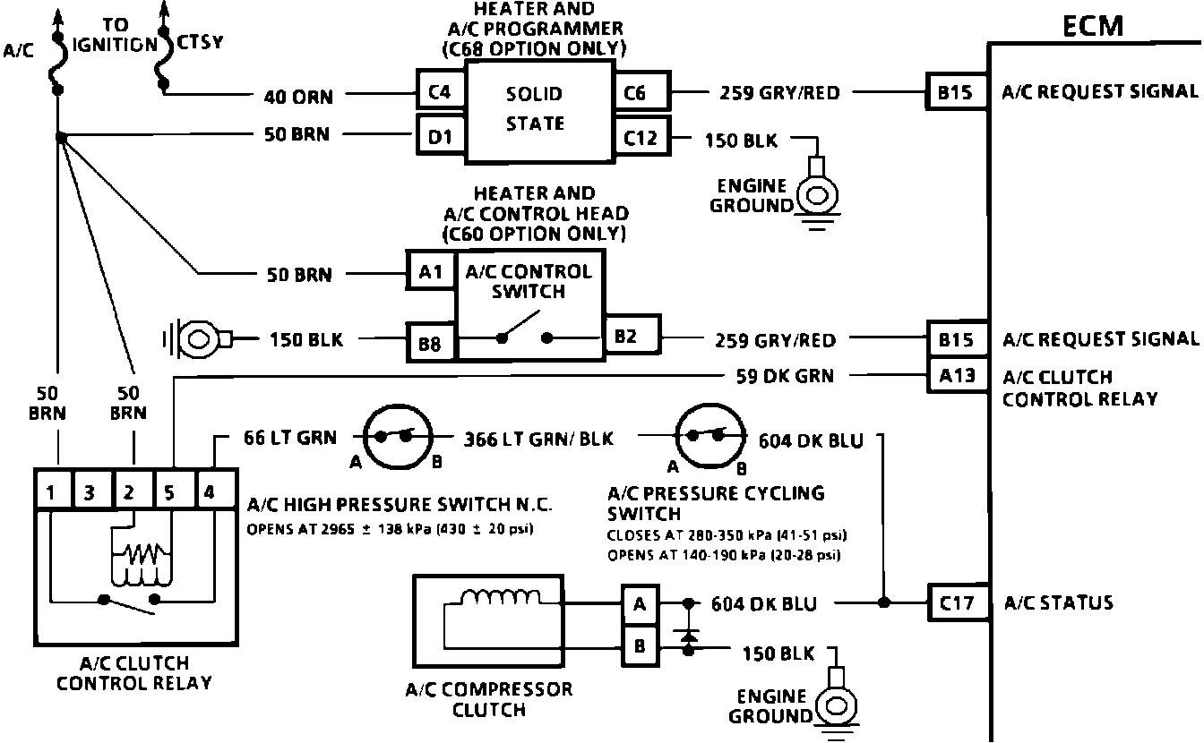 The ECM controls the A/C compressor clutch relay. When the A/C is turned on, the ECM delays the clutch engagement of the A/C compressor to allow the IAC valve to raise the engine idle speed to compensate for the added load. The ECM also causes the relay to disengage the A/C clutch at wide open throttle, high pressure power steering pump loads and when the engine is overheating.